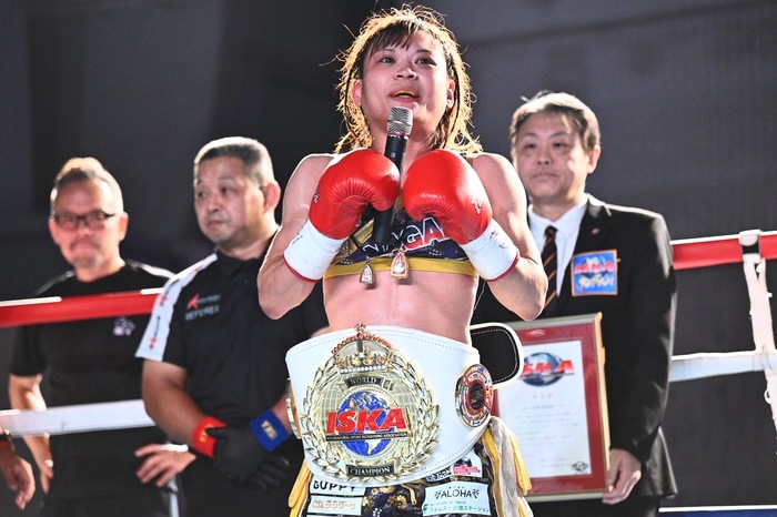 最後は「そこにいる同じベルト持ってる大﨑一貴くん、お願いします」と、婚約者である大﨑一貴をリングに呼び込む。大﨑はRISE世界スーパーフライ級王者であると共にISKAオリエンタルルール 世界フライ級王者であり、揃ってISKA世界ベルトを巻くこととなった。