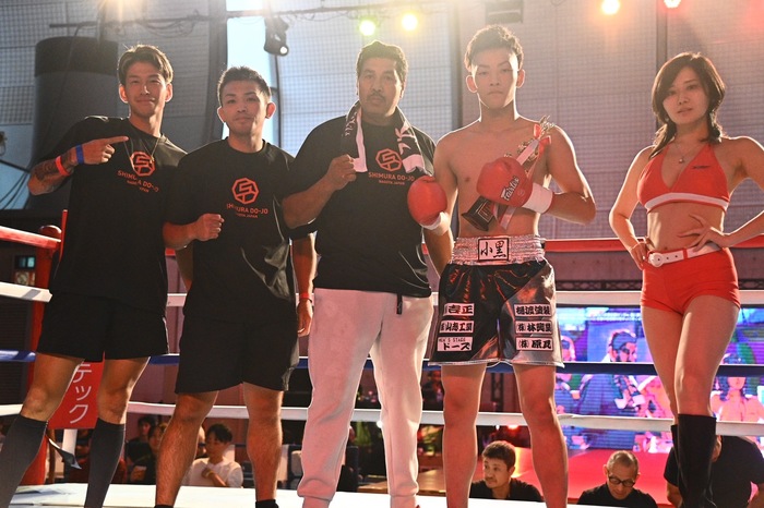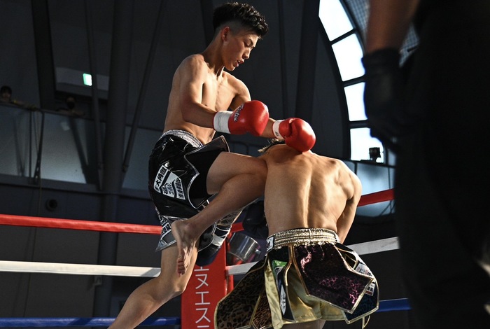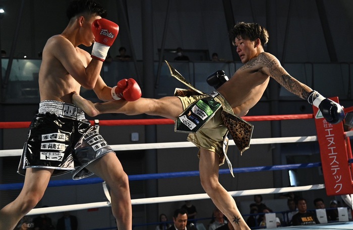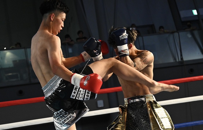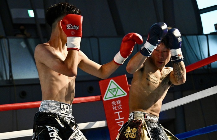 1R開始すぐ、小黒の右インローがローブローになってしまい中断。再開後、サウスポーの青山に右ストレート、右インロー、右ミドルを放って行く小黒。左へ回っていく小黒が右の蹴りを決め、ジャブも伸ばして当てていく。青山は思い切りフックを振っていくが空振りに。