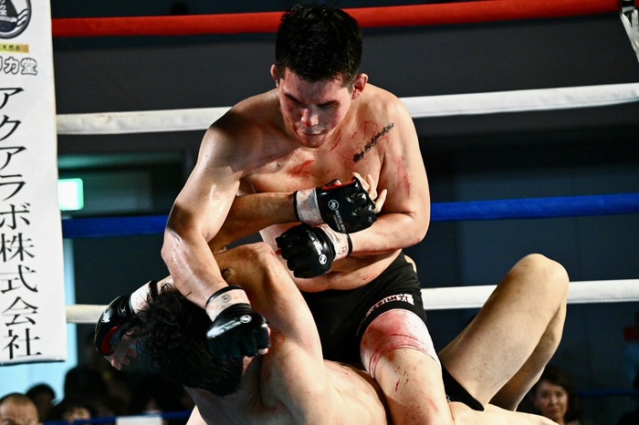 再開。左の蹴りから入る三上にイ・イサクは詰めてボディロックテイクダウン! サイドを奪い右で脇差し。頭を抱える三上は、抱え込みを外し、左ヒザを入れようとするが、クルスフックスにとらえようとするイ・イサクが細かい左のパウンド。三上の右手を両足で挟むクルスフックスでとらえて、鉄槌。