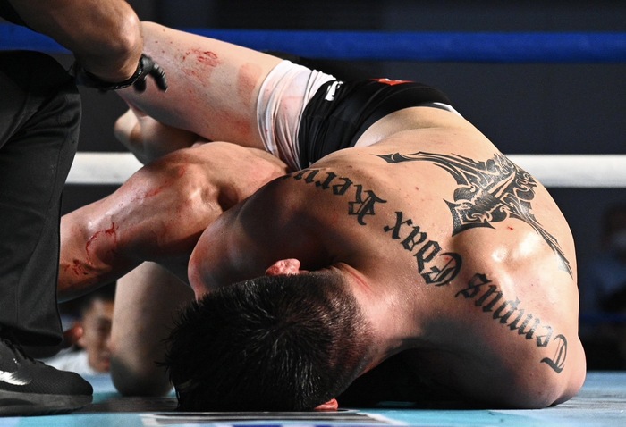 3R、先に左ハイ、左ストレートを突く三上。イ・イサクは右を突いてワンツーで前に。またも鼻血の三上。コーナーに押し込むイ・イサク。ブレーク。三上にドクターチェックで1分39秒で中断。