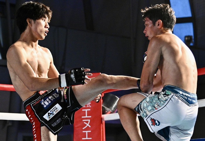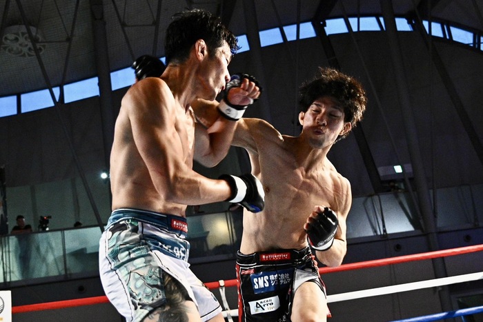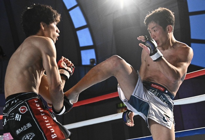 離れる堺に永井は圧をかけていき、堺はバックハンドブローを放つが空振り。前に出る永井に堺が胴タックル。永井は堺を離すと左右の前蹴り。堺も左右フックを繰り出す。ならばと永井は右カーフ、左右ボディ。永井が右カーフからのワンツーで前へ出た。