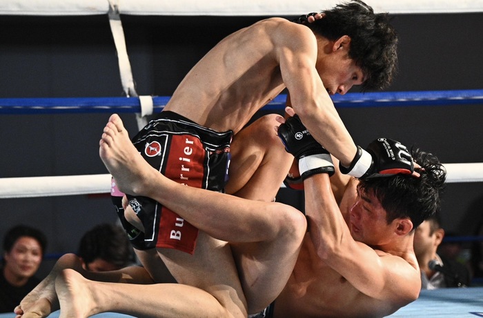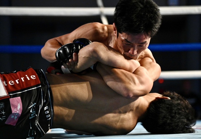 1R、永井が左フックからのテイクダウンに成功し、境は下からのキムラ狙い。そのまま体勢を入れ替えて上になるが、永井が立ち上がる。腕を離さない堺は脚を掛けてグラウンドに行こうとするも永井は左で小手を巻いての右のパンチ。