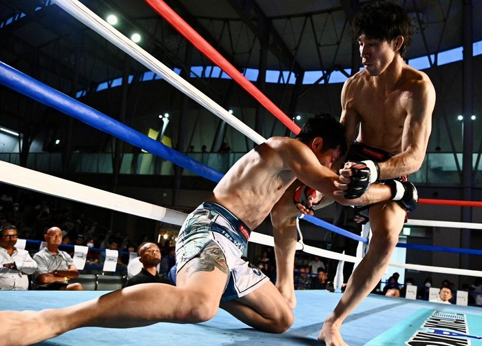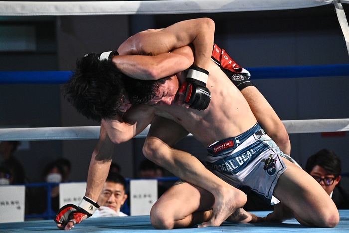 堺がシングルレッグに行くと永井は首を抱えてフロントチョークに。堺が離れると永井が前へ出て右ストレート、右カーフ、前蹴りと攻めていく。堺はシングルレッグに入り、ダブルレッグでテイクダウン。永井はすぐに立ち上がるが、堺はバックから離れない。
