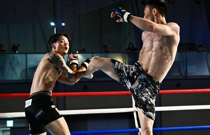 高山は前蹴り、右ハイと蹴っていき、カモンゼスチャーを見せると山田が左右フックで前へ出る。高山が組んでロープに押し付け、足払いでテイクダウンに成功。下になった山田は高山の両腕を抱え、クロスガード。そのままラウンドを終えた。