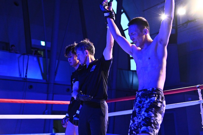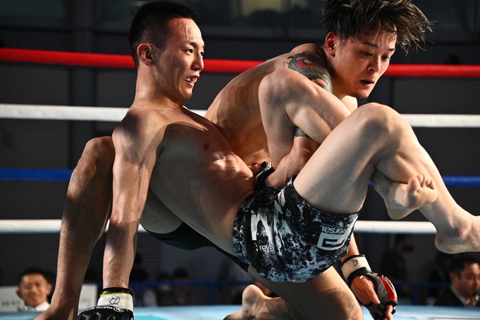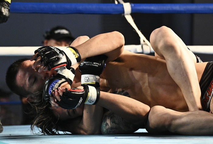 組み付いた高山がコーナーへ押し込み、山田の身体を回してリング中央へテイクダウン。高山はパウンドを見舞って縦四方へ。アームロックを狙うが山田がガードに戻す。