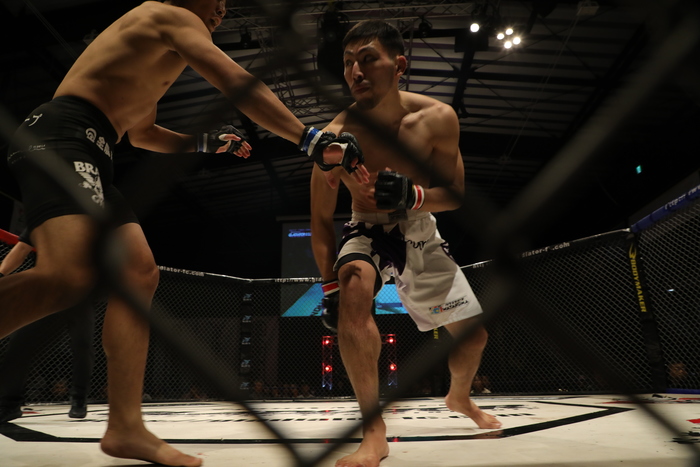 21歳、オーソの荒井は右ミドル、右ストレートで前に。31歳のヅッキーニョスはサウスポー構えから右ジャブ、左ストレートを返す。荒井は右ストレートでアゴを上げさせるが、ヅッキーニョスもダブルレッグテイクダウン。