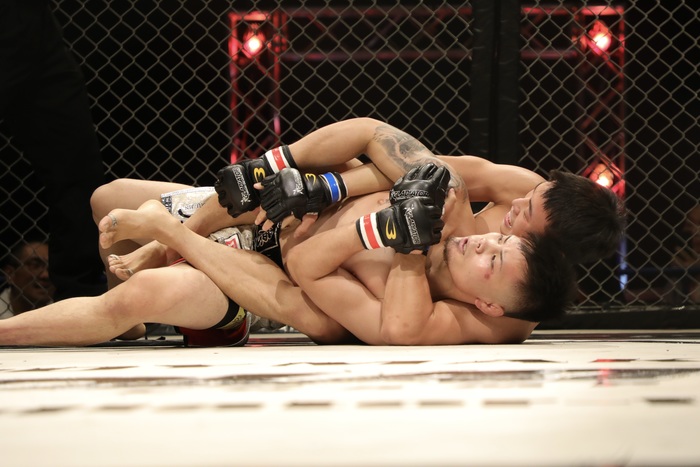 試合はスプリット判定で岩崎が勝利。※組みでコントロールするパクだが、岩崎が打撃を効かせて接戦を制し、5勝0敗に。試合後、あらためて今回試合が流れた久保健太との対戦をアピールした。