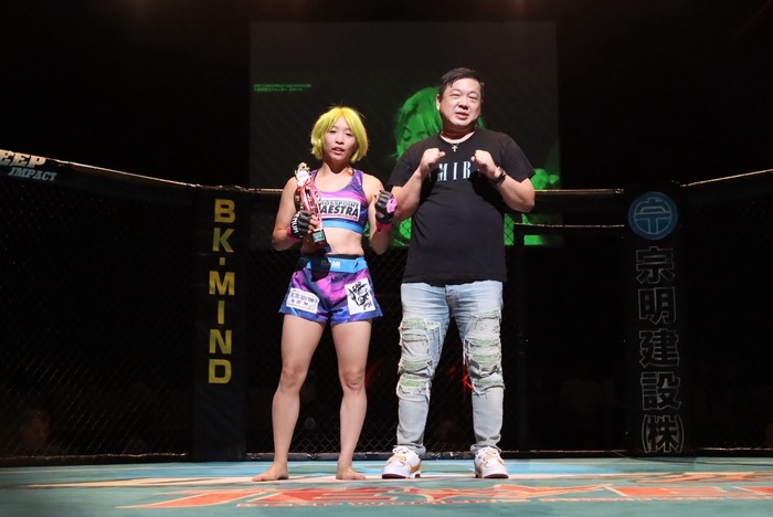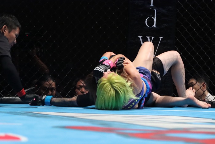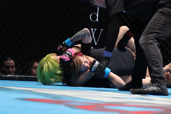 1R、ワンツーで前に出た堀井がダブルレッグから組み付き、足を掛けてテイクダウン。すぐにバックを奪うとリアネイキドチョーク。左腕絞めにセットを変えると成本がタップ。堀井が速攻勝負で嬉しい初勝利を飾った。