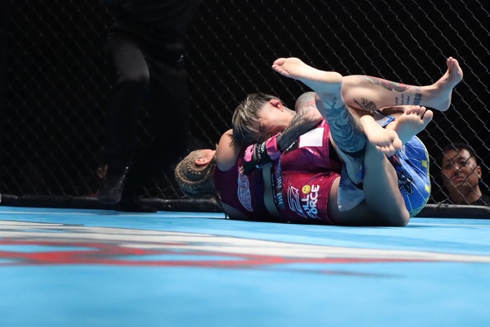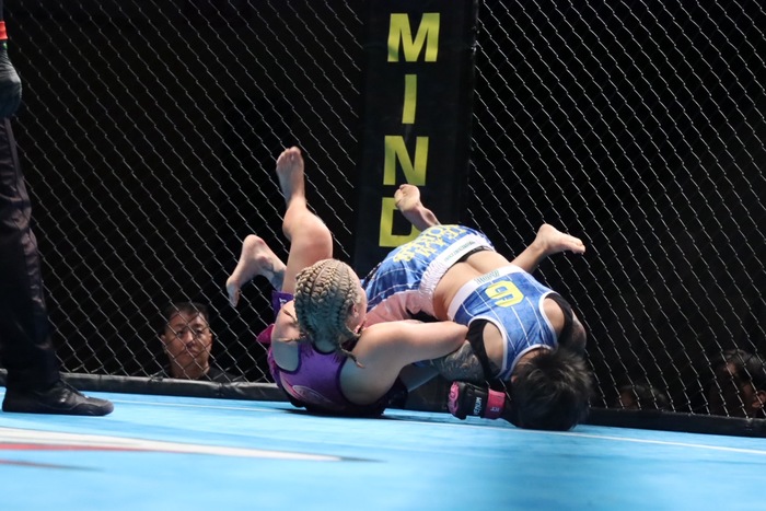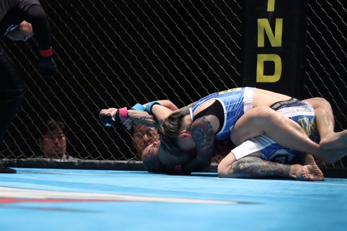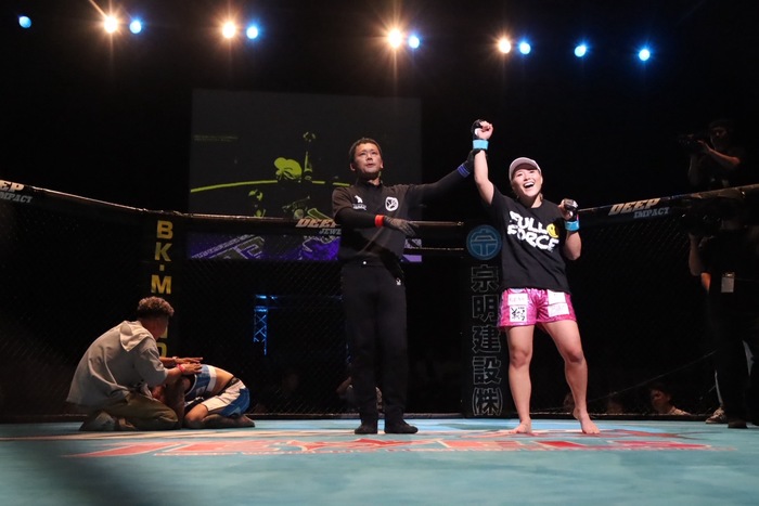 1Rが始まると同時に樹季がダッシュして組み付きにいき、栗山は両脇を差す。樹季は栗山の右腕をアームロックの形にして寝技に持ち込み、得意のストレートアームバー。栗山は体勢を変えて逃れようとするが、樹季は離さない。栗山が上になったところでレフェリーがストップ。樹季が速攻勝負で3連勝を飾った。