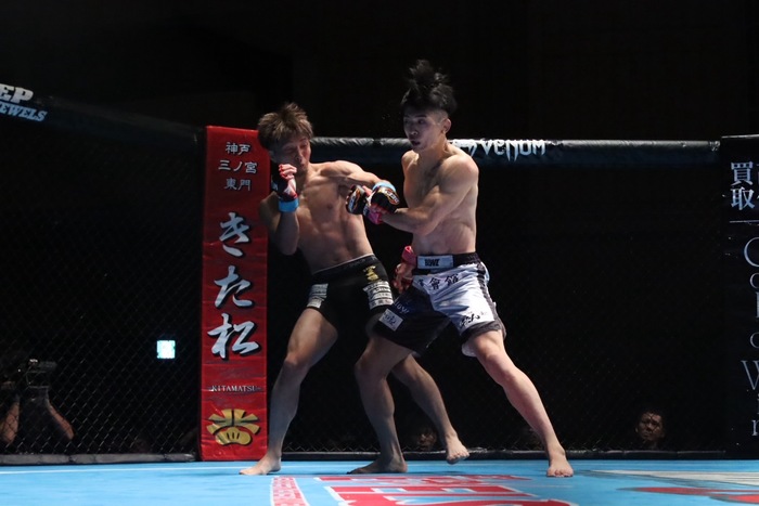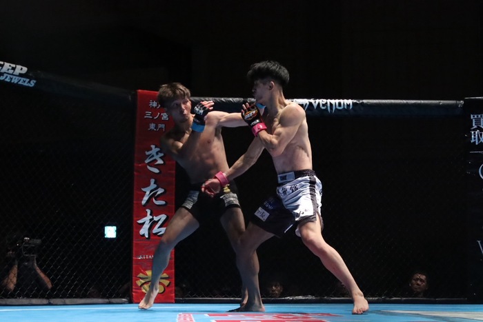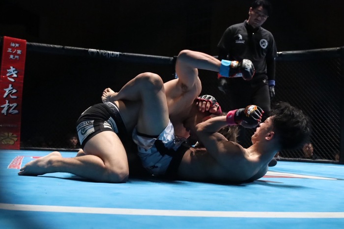 矢野が入ってこようとすると右フックを見せる山﨑。矢野が組み付きに来たところでヒザを合わせた山崎だが、矢野がそのまま組み付いてケージへ押し込み、ボディロックから後ろに投げるようにしてテイクダウン。抑え込む矢野だが、山崎が蹴って脱出。