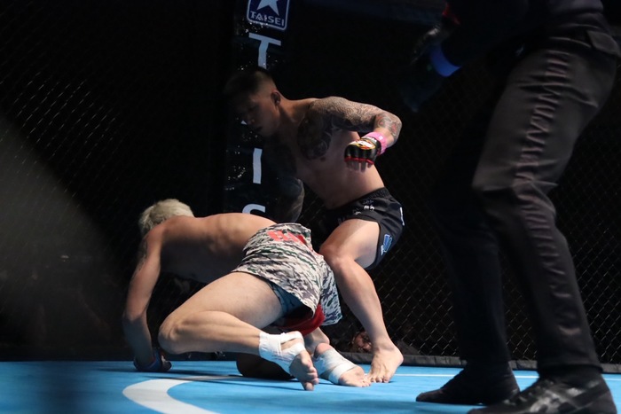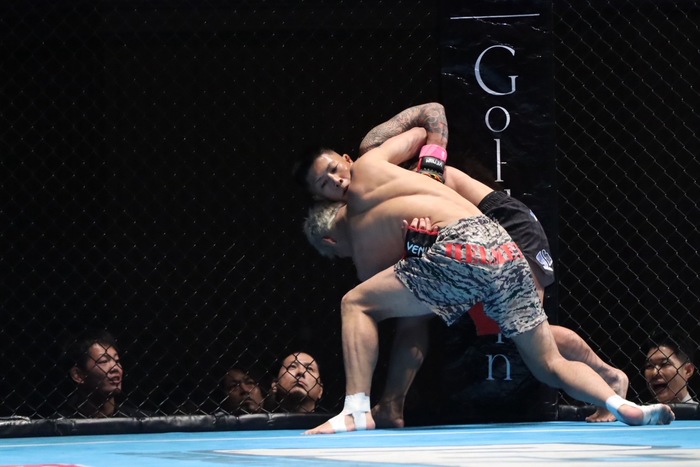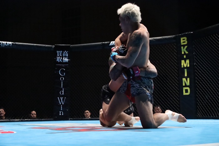 1R、組み付いてきた前田にヒザを見舞った松原だが、前田はそのまま組み付いて松原をケージへ押し込む。前田はヒザ蹴り、松原は投げを打ってテイクダウンし、パウンドを打つ。立ち上がろうとする前田に左右フックとヒザ。すぐに前へ出る松原が右ストレート、松原が組み付くと前田は引き込むような形となる。
