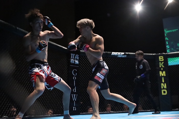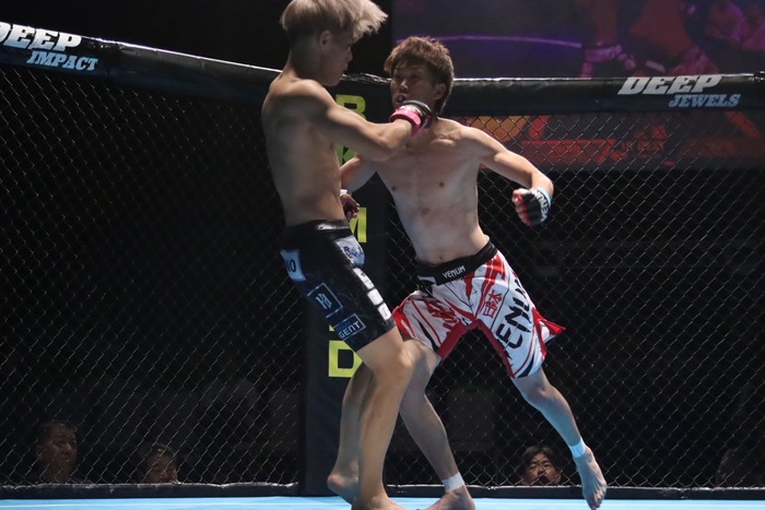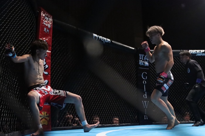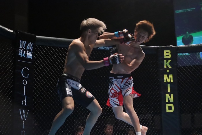1R、砂田はワンツー、古市はジャブから右ストレートを伸ばす。砂田はパンチのモーションからシングルレッグ。ケージに押し込んだ砂田はボディロックからテイクダウンを狙うが、古市はケージを背に耐える。砂田は左ヒジを打って離れると、前後にステップを踏んで右ロー。古市はいきなり飛び込んでのパンチを多用する。