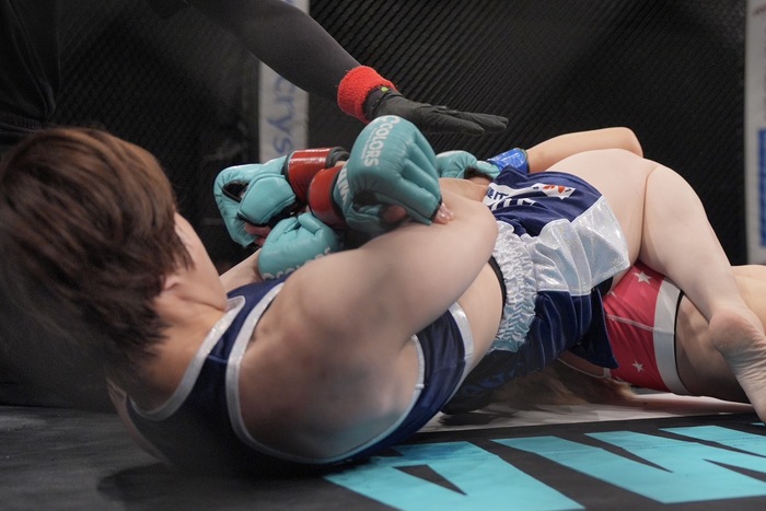 1R、オーソの青野、サウスポー構えの中村が前蹴りもつかんだ青野がテイクダウンへ。そのまま押し込み、両差しも差し返す中村。青野はシングルレッグでテイクダウン。中村は下から蹴り上げ。足関も狙う。蹴り上げを顔面にもらいながらもさばく青野。