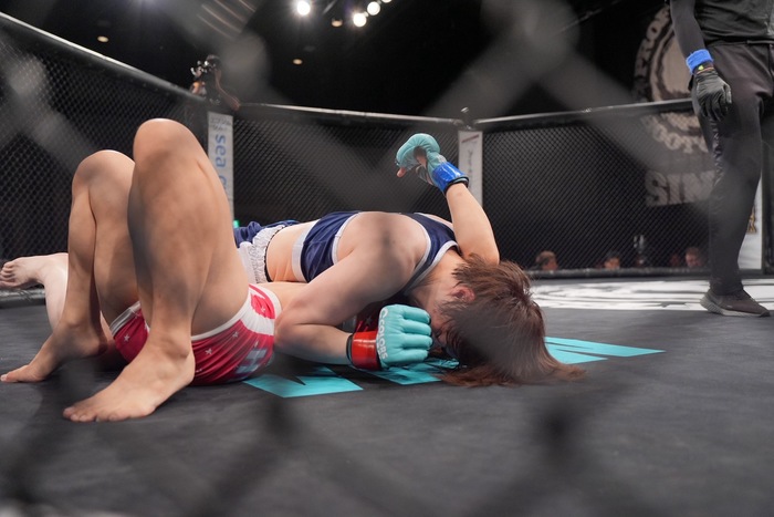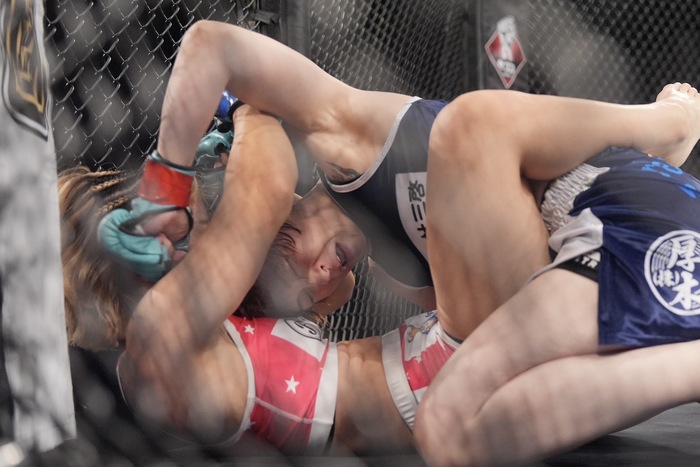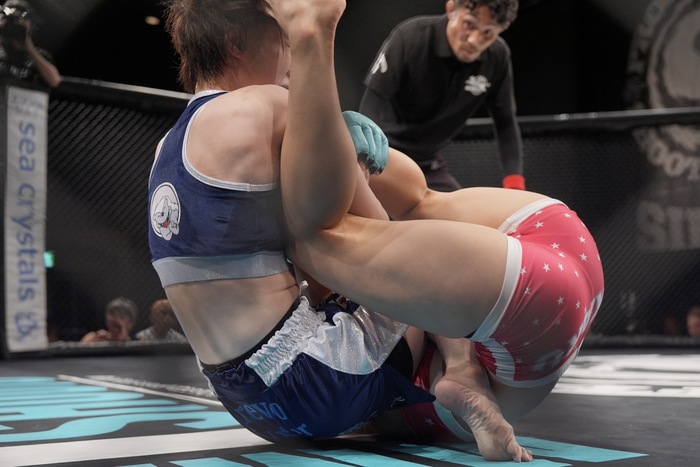 下から腕十字狙いの青野をつぶしてハーフから細かいパウンドの中村。青野がかけた左足を肩で押し込んだままパウンド。サイドにパス。ボディヒザからクルスフックス! 青野はケージを蹴るもサイドのままの中村がトップからボディにヒジ。サイドから腕十字を極めてタップを奪った。