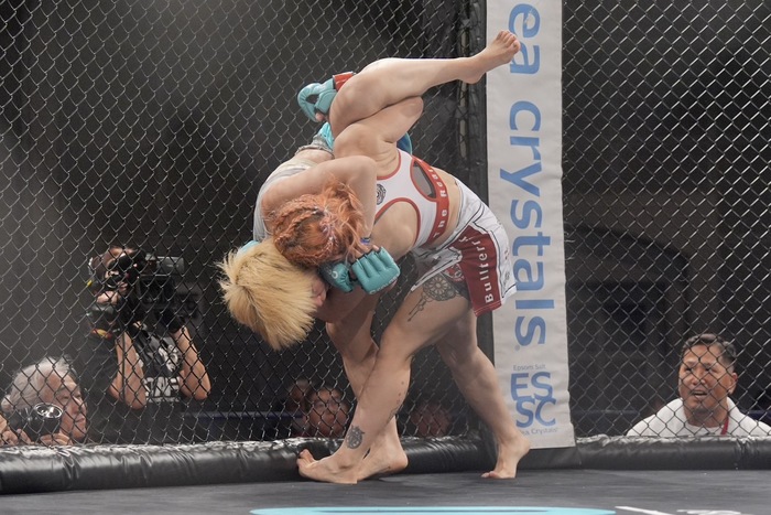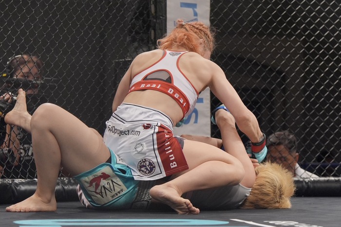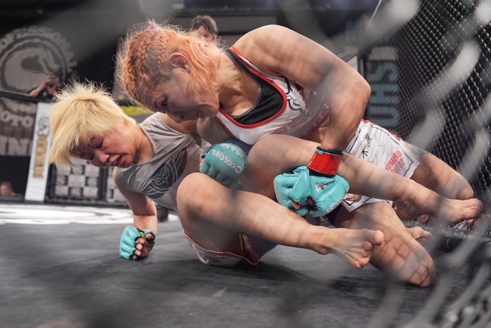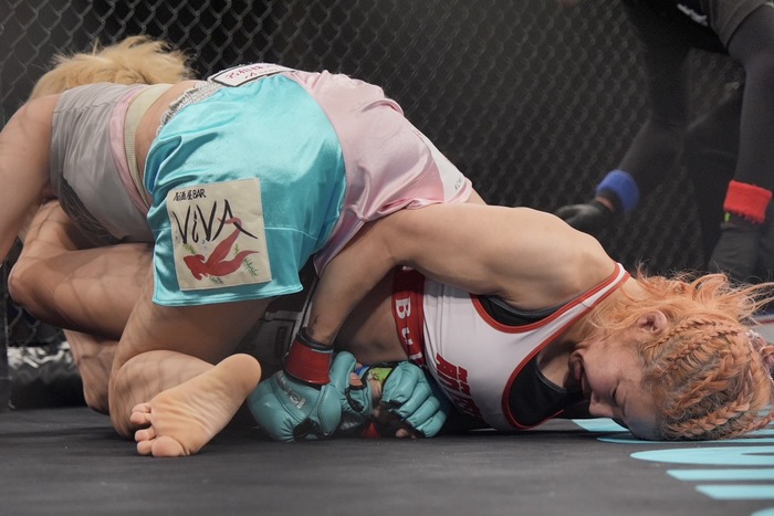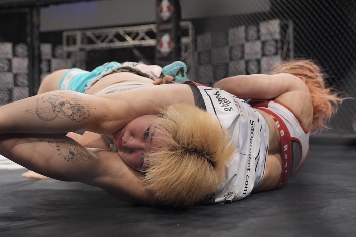 両足フックに足を極めようとする嶋屋は、スクランブルで座るが、なおもバックから寝かせる村上は、サイドから腕十字。ここもまたいで外した嶋屋が上からパウンド狙いも、立つ村上が組んで倒してホーン。