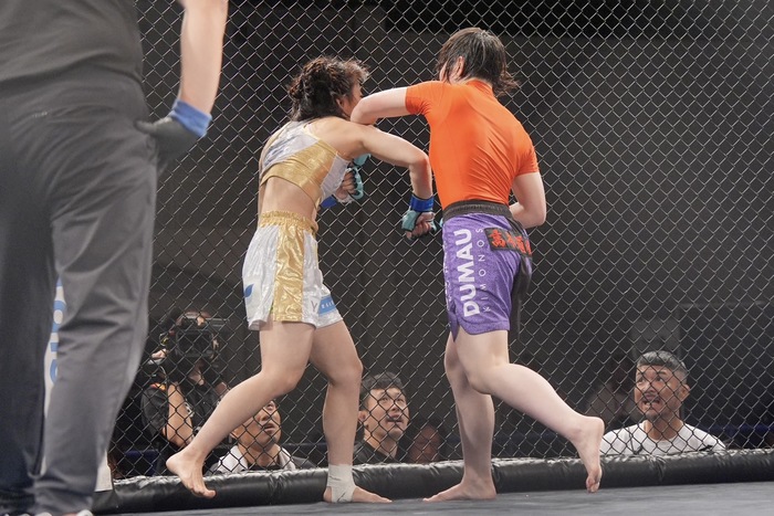 右で差して押し込む高本は左ヒザを連打。左小手の片山は胸を合わせてヒザに右を合わせて突き放す。ワンツーの右を当てる片山。高本のヒザにカウンターのダブルレッグテイクダウンで片山が上のままホーン。