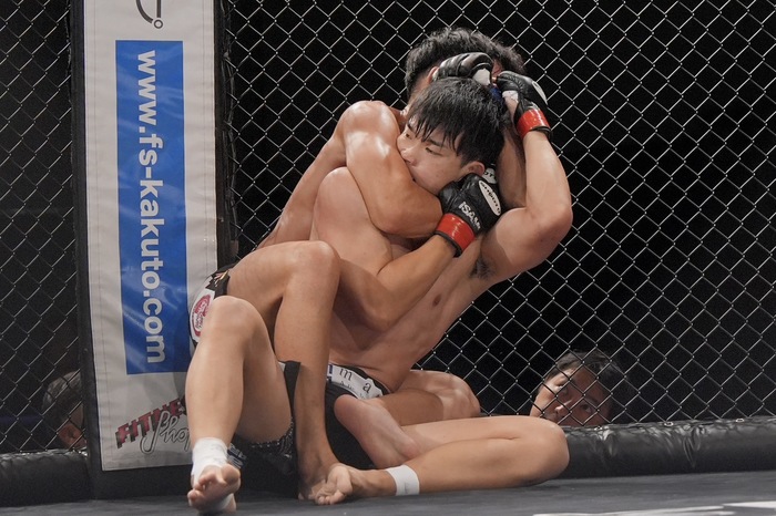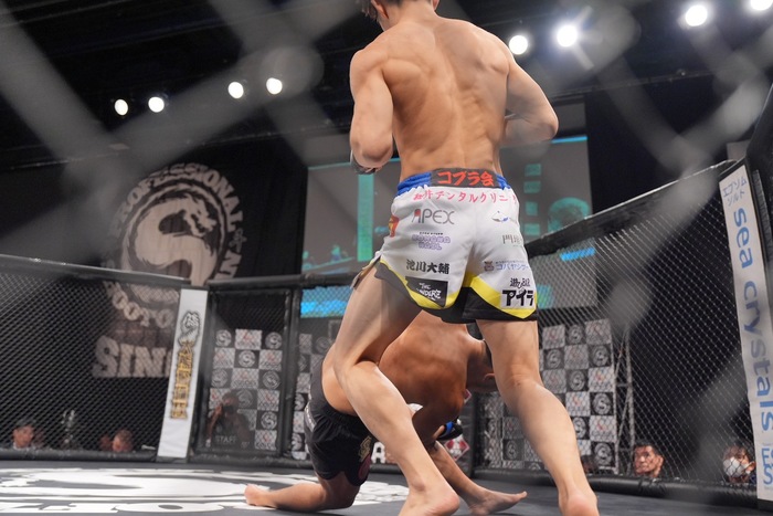 2R、詰める勝呂のダブルレッグにヒザを合わせる関根。勝呂はそのまま掴んでテイクダウン。右足を超えてハーフに。パスしてサイドに回るも関根背中見せて立ちに。なおもボディロックで崩す勝呂。ダブルレッグでテイクダウン。腰をクラッチして抱いて引き出す勝呂。下からヒジを突く関根。最後に体を上げてパウンドの勝呂に関根が蹴り上げて離してホーン。