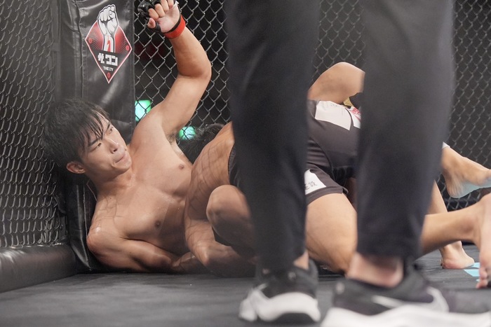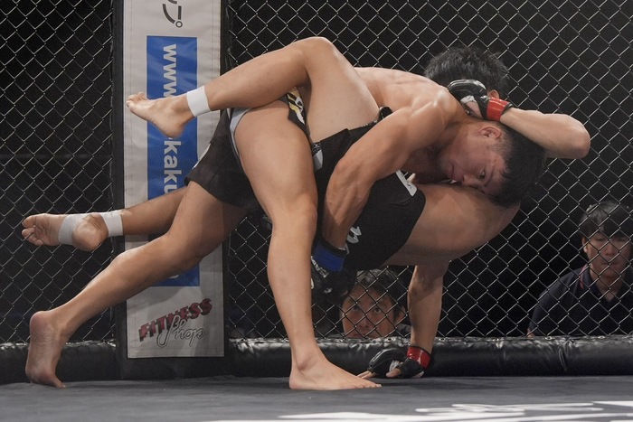 1R、先にシングルレッグからボディロックテイクダウンの勝呂。金網使い立つ関根。なおも左差しでボディロックからケージ内側に大内刈テイクダウンの勝呂。ケージまで動き、亀から立とうとする関根。勝呂は左足をかけて右リストコントロールから右足もかけて両足フック。リアネイキドチョーク狙いから仰向けになった関根にパウンド。バック、たすきでゴング。