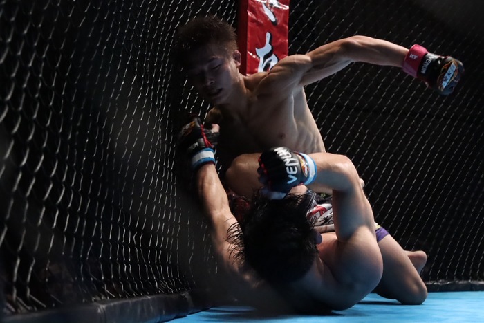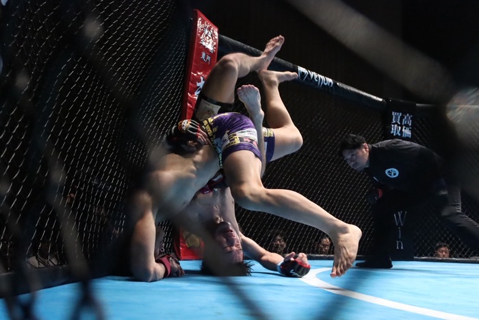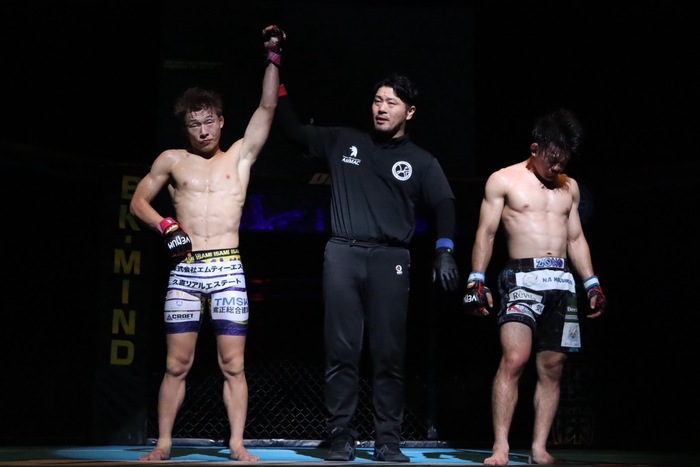 前園のダブルレッグに小崎は右の小手を巻いて上になる。背中を着けさせる小崎はヒジ、鉄槌、パウンド。前園も下からパンチを打つが小崎が殴って試合を終えた。