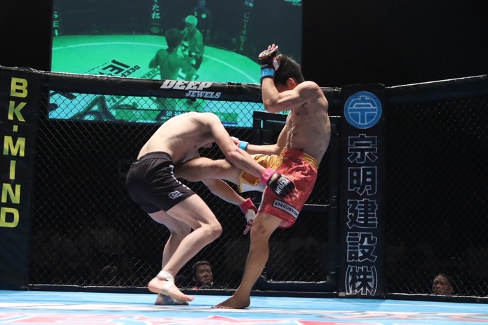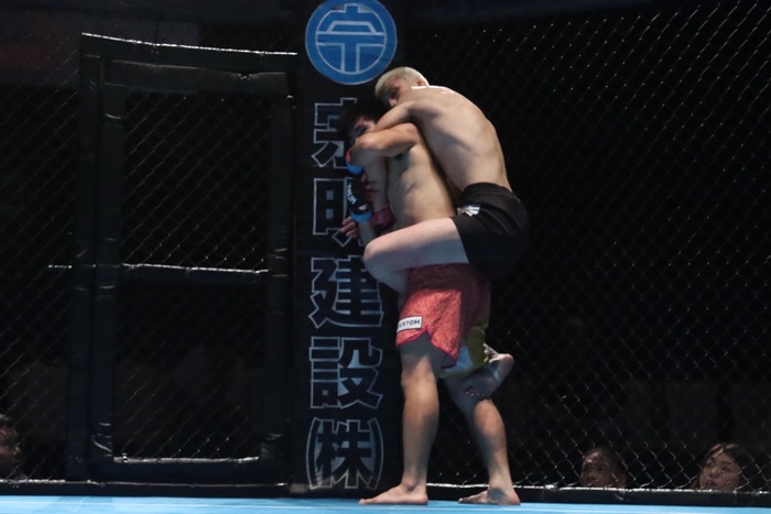 2R、大空斗が組みに行って時任をケージに押し込む。時任は首相撲からのヒザ。大空斗はその足をつかみ、回してテイクダウンする。ヒジを落とす大空斗に時任も下から右フックを連打する。大空斗は立ち上がると、起き上がろうとした時任に三角を仕掛けようとするが時任が抑え込む。腰を上げた時任はパウンド。