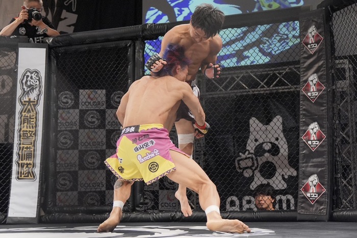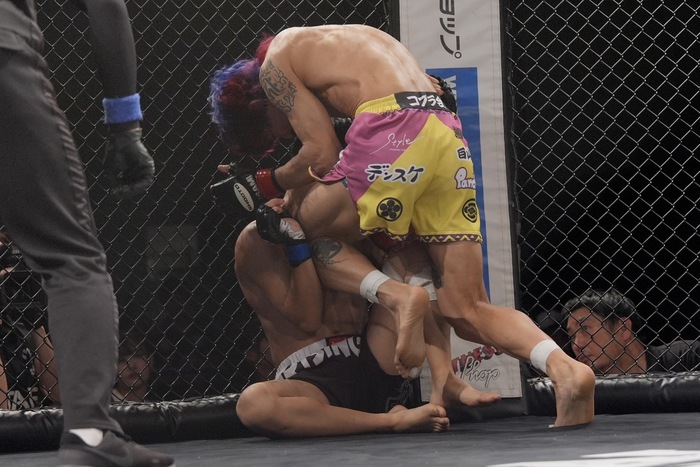 マッチョが組みに来る立ち上がりを見据えて右跳びヒザ! マッチョが前のめりに倒れ、パウンドにすぐにレフェリーが間に入った。