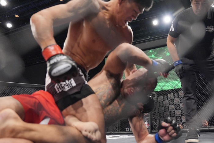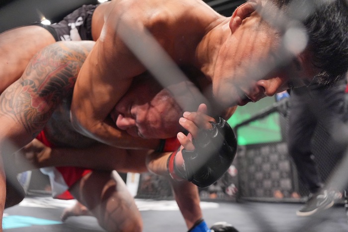 飯野の右に齋藤も右を返すと、飯野は低いダブルレッグからケージに押し込み。左で差してボディロックテイクダウンの飯野はマウントからバック。左手首をコントロールして、右で背後からパウンド、ヒジ、バックマウントからパウンド連打! 齋藤は足を外してスクラウンブルから立ち上がり。