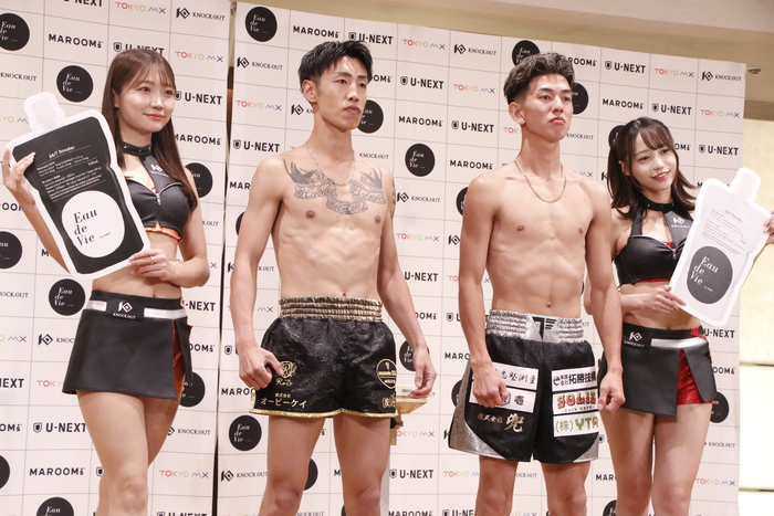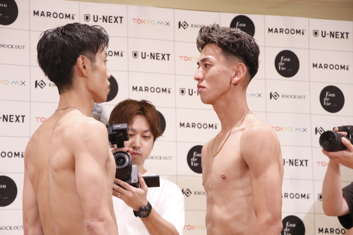 セミファイナル(第11試合)のKNOCK OUT-BLACKスーパーバンタム級王座決定戦3分3R延長1Rで対戦する、森岡悠樹(北流会君津ジム)は54.9kg、福田拓海(KNOCK OUTクロスポイント大泉)は54.95kgでそれぞれ計量をパス。