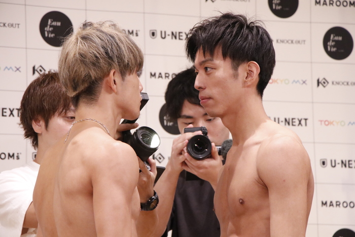 第9試合のKNOCK OUT-BLACKフェザー級3分3R延長1Rで対戦する、玖村修平(K-1ジム五反田チームキングス)は57.5kg、雅治(レンジャージム)は57.4kgでそれぞれ計量をパス。