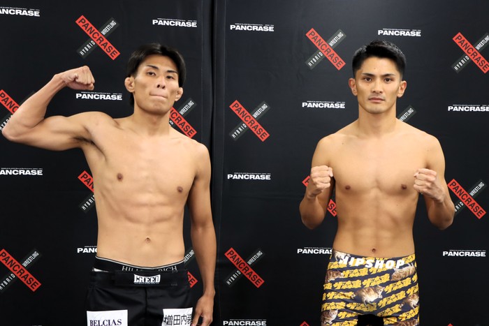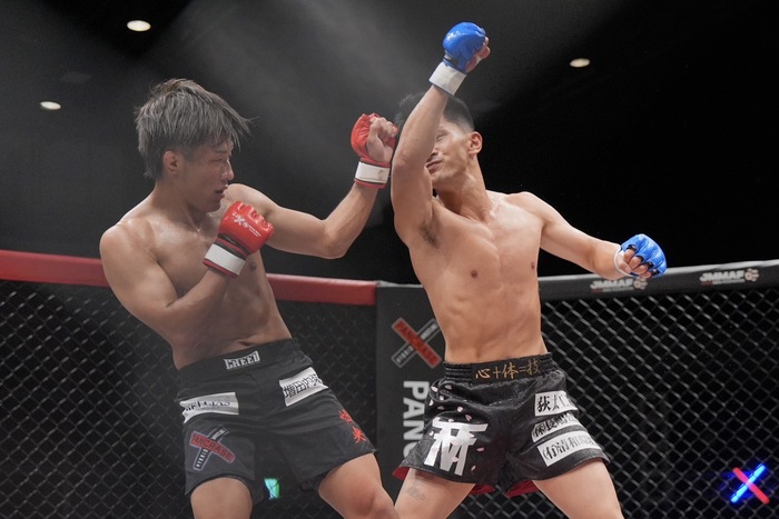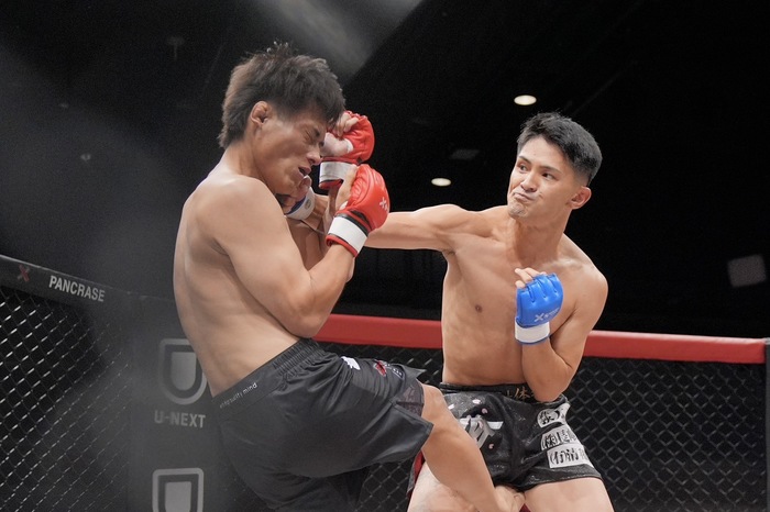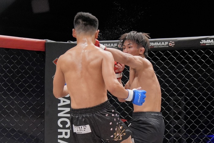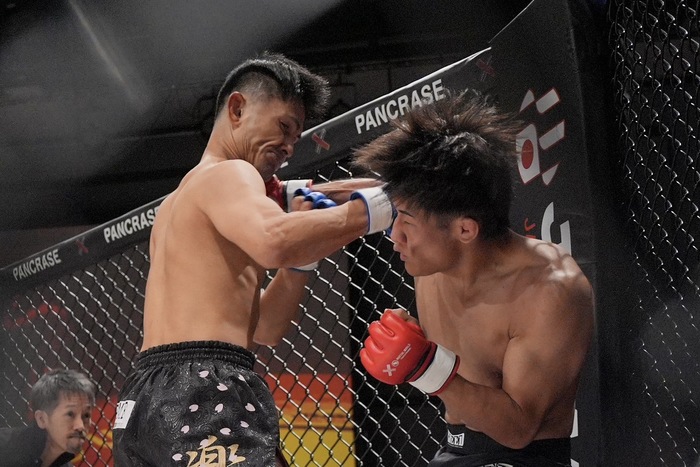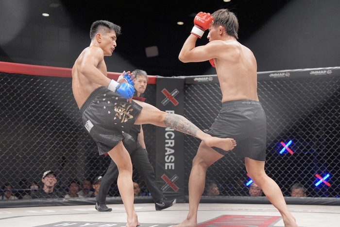 1R、増田はシングルレッグ。差し上げる水島は四つに。突き放してサウスポー構えから左で詰めるが、ケージ背にする増田が右でダウンを奪う。左インローの水島。さらに左オーバーハンド、左ハイで前に。増田をケージに詰めて跳びヒザも。増田のシングルレッグを切ると、スタンドに戻して左ヒザで増田を崩す。