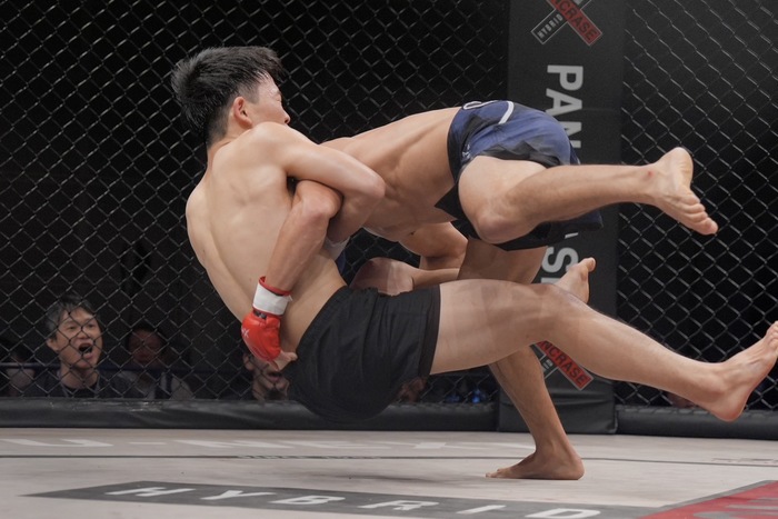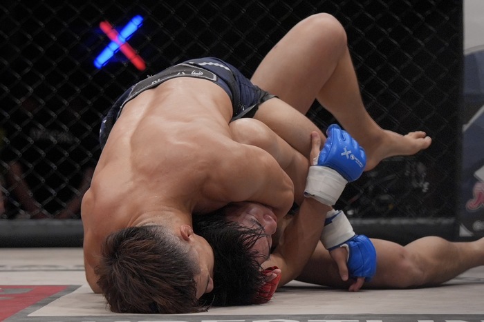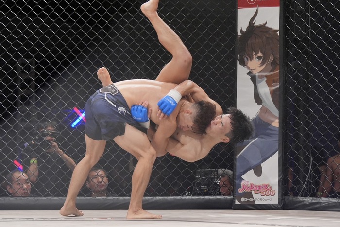 3R、詰める土屋は右。潜る齋藤はダブルレッグからケージ押し込みも、突き放す土屋。なおも組む齋藤。シングルレッグから四つに。体を入れ替える土屋は離して前に出るが、組む齋藤は持ち上げてテイクダウン! スクランブルの土屋にネルソンからスープし、バックからリアネイキドチョーク狙いでホーン。