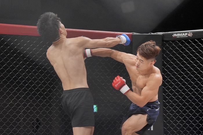 1R、ともにオーソドックス構え。両者カーフから。ボディ打ちの土屋。組む齋藤。土屋は外掛けテイクダウンを狙う。残して投げてテイクダウンは齋藤。打撃でも手数を出した齋藤をジャッジ3者が10-9で支持。