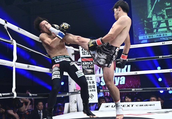 2Rもコーナーへ詰めていく古木。前蹴りからワンツー、左フック。このラウンドは内藤も左右フック、右ローと手数を出す。古木は内藤の返しのパンチをバックステップでかわし、蹴りからパンチへつなぐ。古木が右フック強打、内藤は右ミドルを蹴る。左フック、右ヒザとクリーンヒットさせる古木だが、内藤は右ストレートで前へ出る。左右フックの古木に内藤も左右フック。