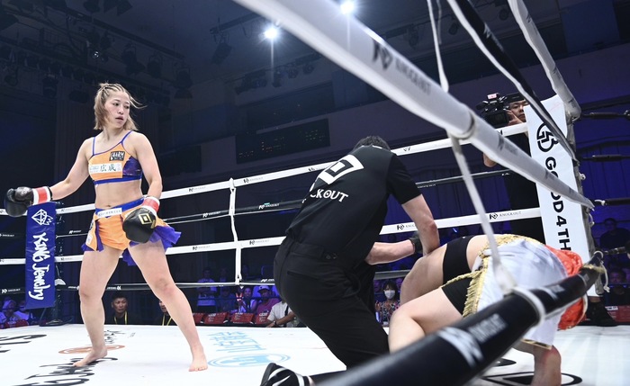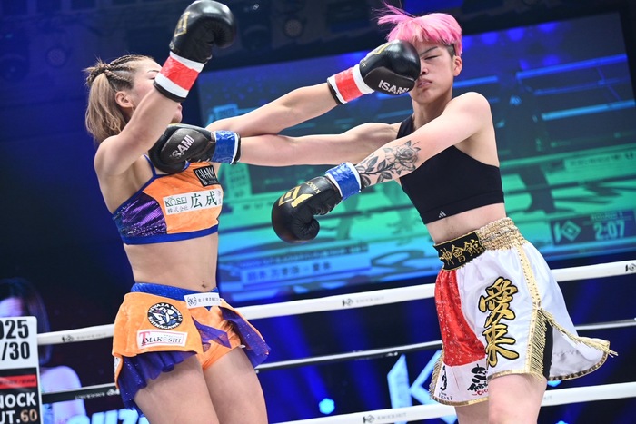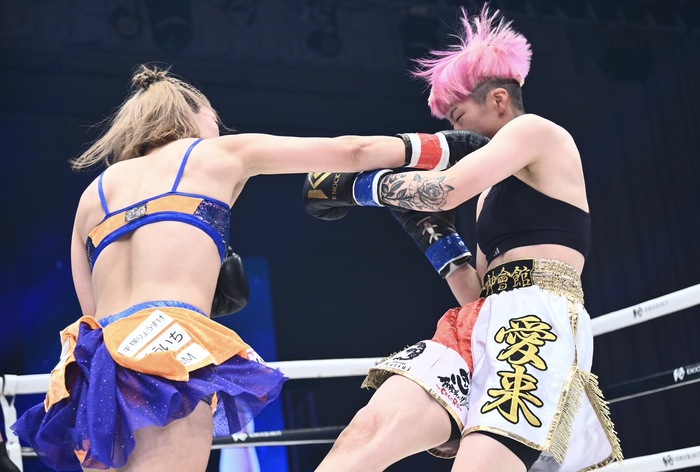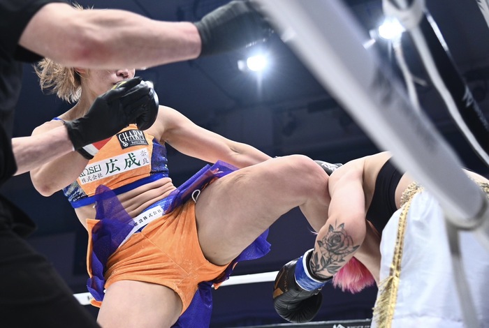 得意の右オーバーハンドを連続ヒットさせると、鈴木はロープに詰めた愛来に左ボディ、これで落ちかけた愛来の顔面を左ハイで蹴り上げ、豪快なKO勝ちを飾った。