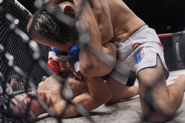 詰める張豊の右を気にした斎藤は右小手で払い腰テイクダウン! そのままバックに回るが両足は効かず。正対した張豊に下から三角絞め狙い。外れると立つ斎藤。張豊はなおも押し込みテイクダウン。ハーフの斎藤に肩固め狙いつつ鉄槌も、立つ斎藤も疲弊。