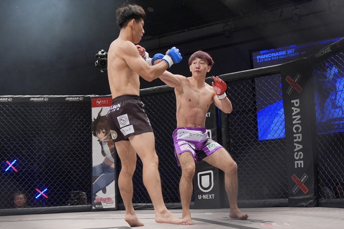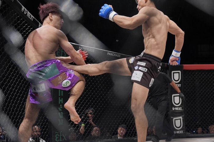 1R、サウスポー構えの梅原は左の蹴りから。オーソの宮城は右前蹴り。今成ロールの梅原を切って足を蹴る宮城。さらにスタンドから下の梅原にパンチも。ブレーク。