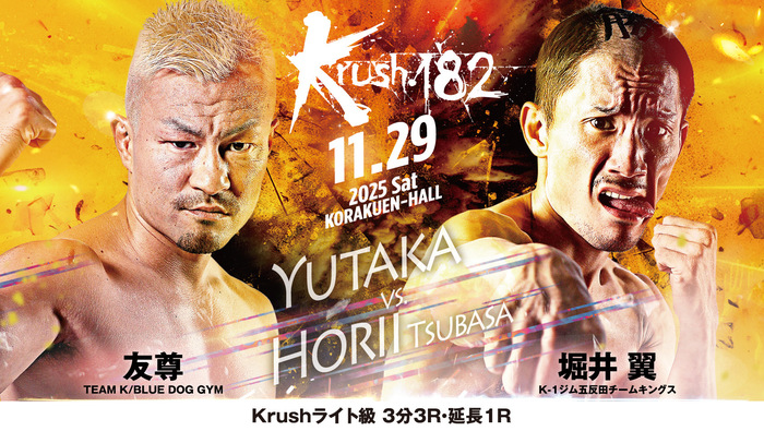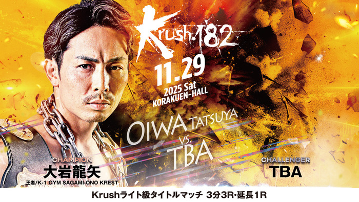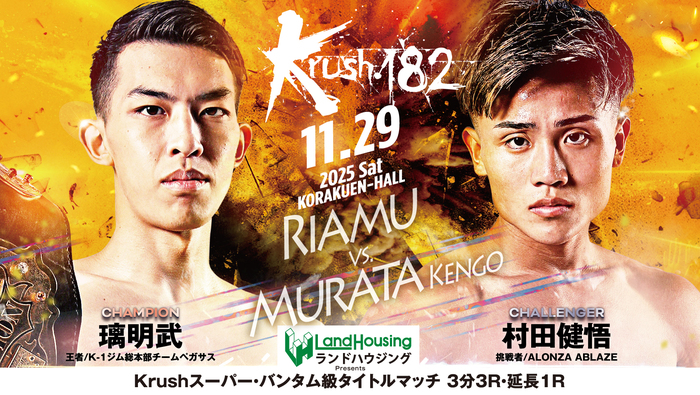 今大会ではKrushライト級王者・大岩龍矢(K-1 GYM SAGAMI-ONO KREST)が初防衛戦を行うことが決まっている(挑戦者は9・27大会の大谷翔司vs.児玉兼慎、篠原悠人vs.瑠久のそれぞれ勝者のうちどちらかを大会後に主催者が選ぶ形で決定される)が、新たにKrushスーパー・バンタム級タイトルマッチ3分3R延長1Rで、王者・璃明武(K-1ジム総本部チームペガサス)が村田健悟(ALONZA ABLAZE)を挑戦者に迎えて4度目の防衛戦を行う。