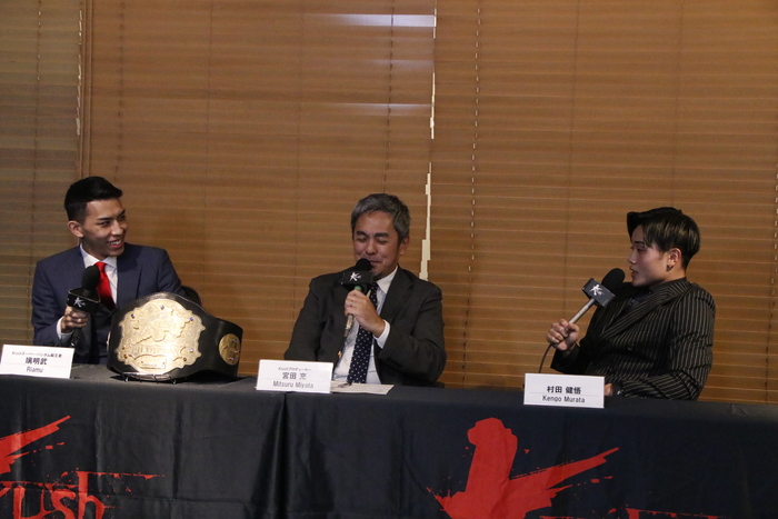 さらに璃明武は「タイトルマッチがもう1試合ありますけれど、村田くんは無敗だし、自分も4度目の防衛戦なので自分たちの試合をメインでお願いします」と宮田充Krushプロデューサーに直訴。村田も「僕と璃明武選手がライト級よりも盛り上げるのでどうですか」と、2人で挟んで宮田Pへ要求。