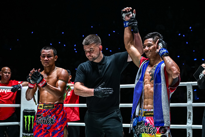 試合終了のゴングが鳴ると、スーブラックは跪いて敬意を表し、セクサンの手を上げる。判定は3-0でスーブラックの完勝となった。