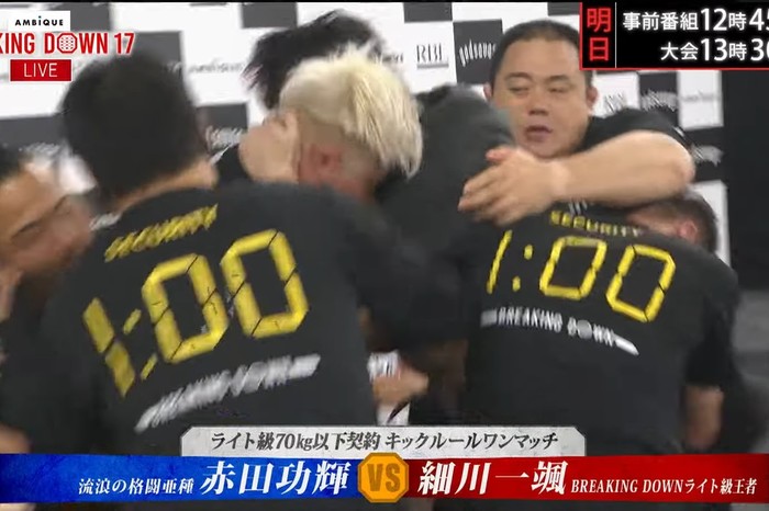 両者は公開計量を終えると、フェイスオフで赤田が突き飛ばし、細川がビンタしてヒザ蹴りで報復。つかみ合いとなってセキュリティが両者の間に入って止める乱闘となった。