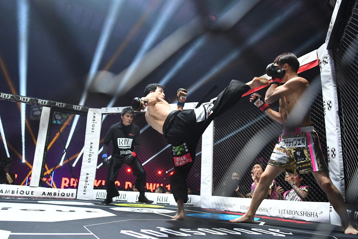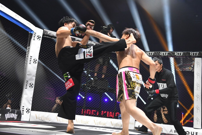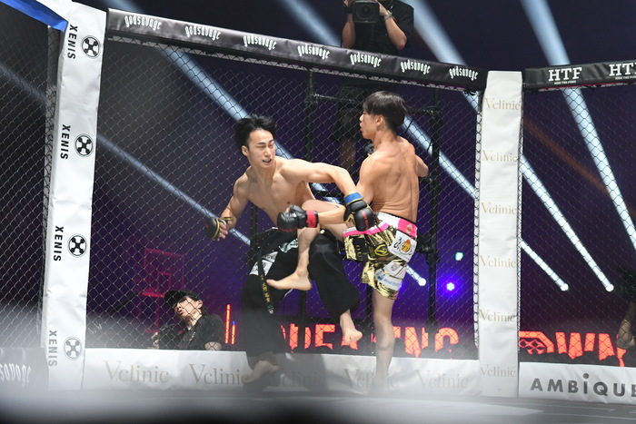 本戦の判定は0-0で延長戦へ。大野が右ミドルを蹴ると井原がフックを合わせに来る。これを警戒してか大野は組みつく。井原が前蹴りから右フック、大野は左フックを当てるが、そのまま転倒。そこへ井原がパンチを見舞ってしまい大野にインターバルが与えられた。