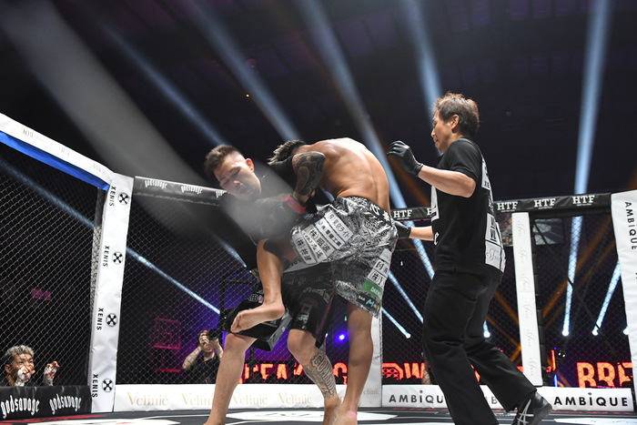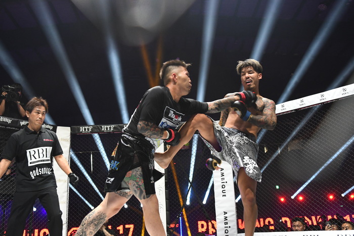 右ハイを2発蹴る江口に桜井が右ストレート、江口はパンチを思い切り振りに行き、右フックをヒットさせる。打ち合いになり、ここでも江口の右が当たる。桜井は左の三日月、右フックで突進する江口に桜井はクリンチ。最後は江口がヒザを見舞った。