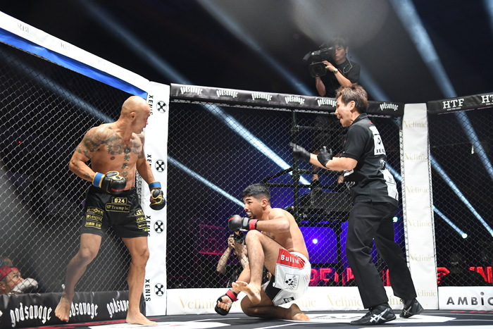 いきなり飛び蹴りのクサノ。打ち合いに来たクサノに内藤の右フックがカウンターでヒットし、ダウンを奪う。続いて右フック2発で内藤が2度目のダウンを奪い、KO勝ちとなった。