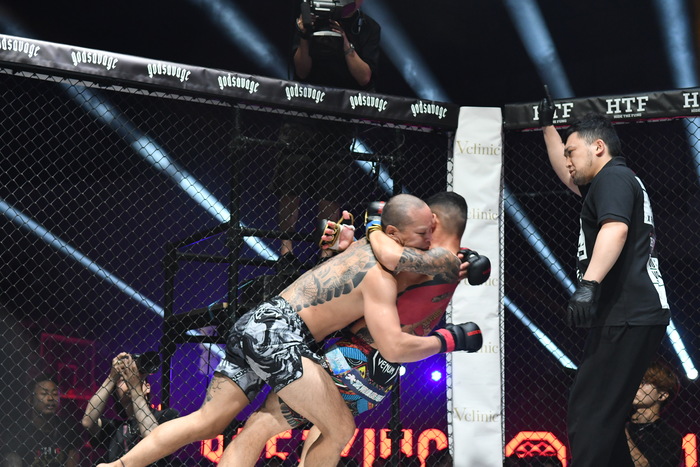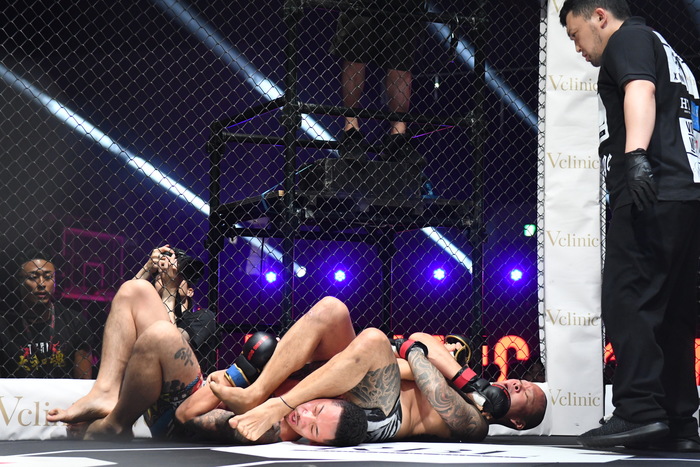 ダイスケが連続でテイクダウンを奪うもブレイク。3度目のテイクダウンで腕十字を極めにいったが極まらずブレイク。一本背負いからフロントチョークにいったダイスケ。これもブレイク。