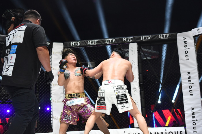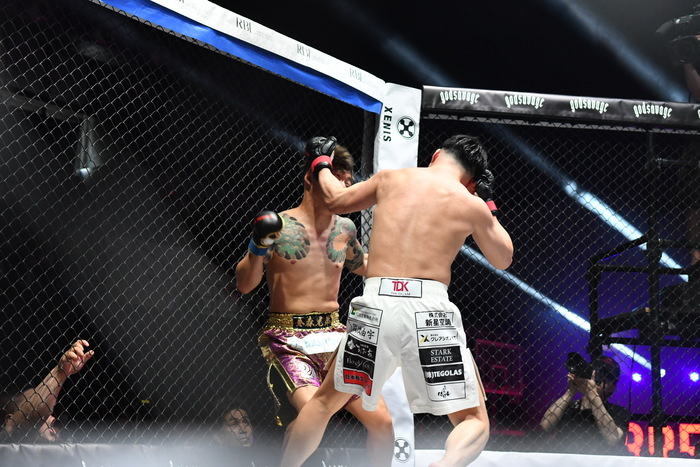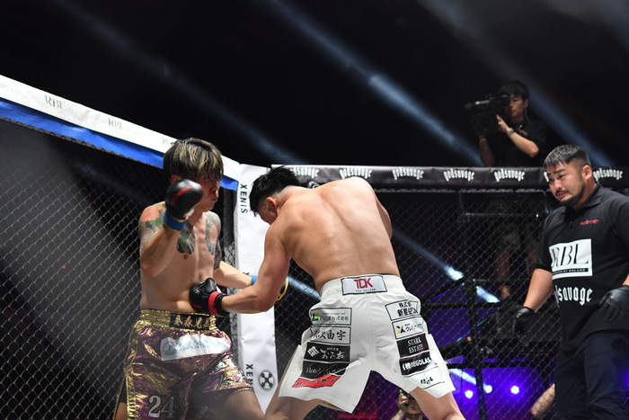 金森がジャブ、山本は左ボディからの左フックで一気にラッシュをかけ、金森も左右フックを繰り出す。山本は左右フックで打ち合いながらも左ボディをしっかり入れていき、その左ボディでダウンを奪う。