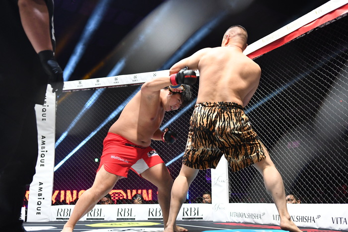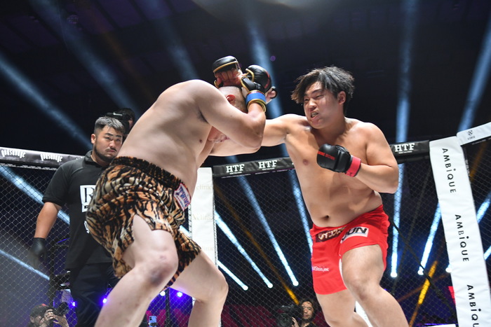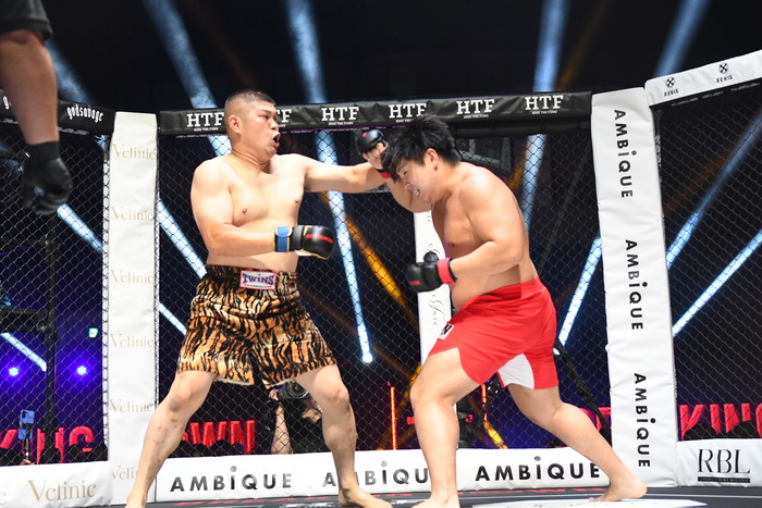判定は0-0でドロー、延長戦へ突入する。赤パンの連打が高橋を捉え、高橋は下がりながらジャブを当てていく。高橋は右フック、赤パンは高橋の左に右フックを被せ、この一発で高橋がケージを背負ってディフェンスに。そこをパンチで攻め込む赤パン。