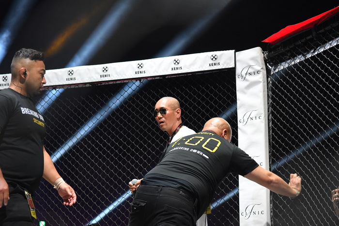 判定は5-0で赤パンの勝利となった。しかし、赤パンは納得がいかないのか高橋に突っかかり、ケージ内は一時混乱に。怒った村田まで乱入。親子喧嘩が始まった。