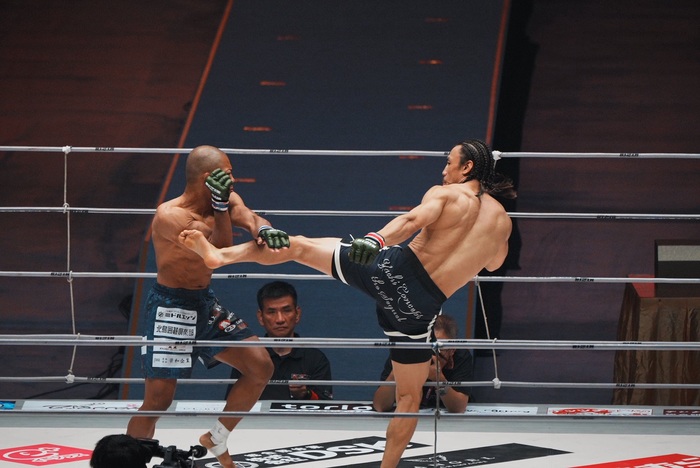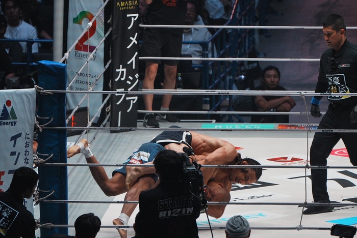 1R、グローブタッチ無し。サウスポー構えの矢地はいきなり左ミドルから。オーソの芳賀は、左前手を突いて近づくが、さばく矢地は左で差して四つに。しかし芳賀も左で差して崩し。ここは残した矢地はコーナーを背に。そこにヒザを突く矢地だが、芳賀は左で差して払い腰テイクダウン!
