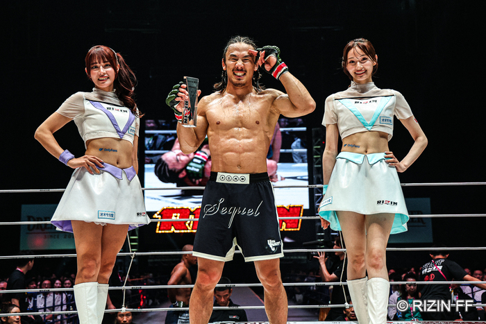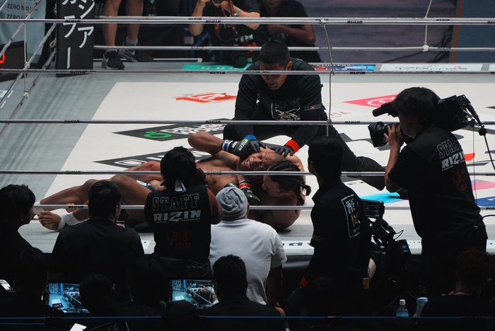 この際で左腕も左足で縛って4の字で組んだ矢地は、グラウンドに引きずり込み、片手でディフェンスする芳賀にリアネイキドチョーク! 頸動脈には完全には組めずも、最後はパームトゥパームで絞めてタップを奪った。