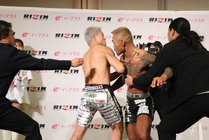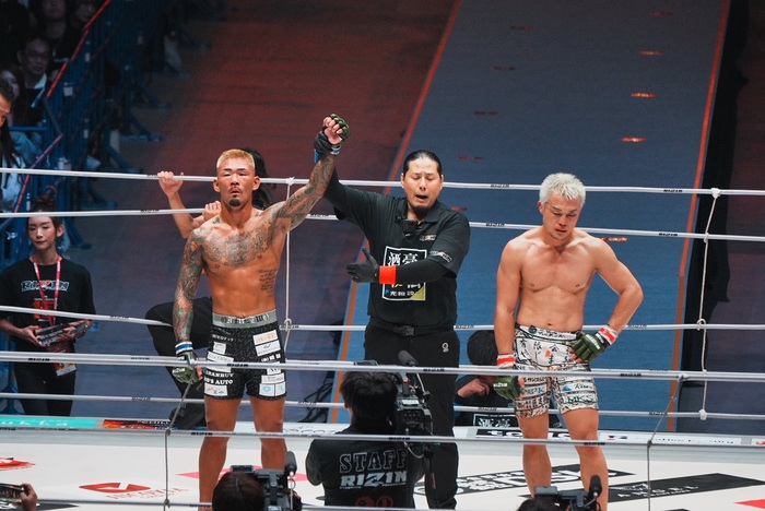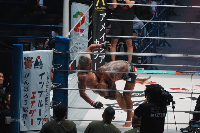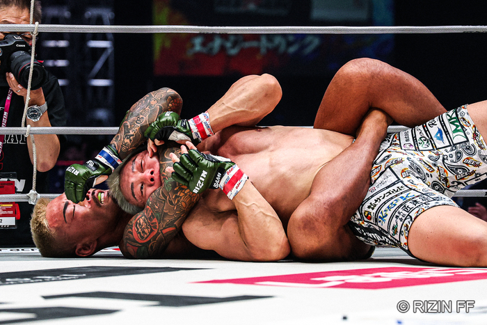 1R、洸助が組んでコーナー際でテイクダウン、バックに。ボディロトライアングルからリアネイキドチョーク狙い。腰をずらして立ち上がり殴り合う太田に、洸助も右を返してゴング。