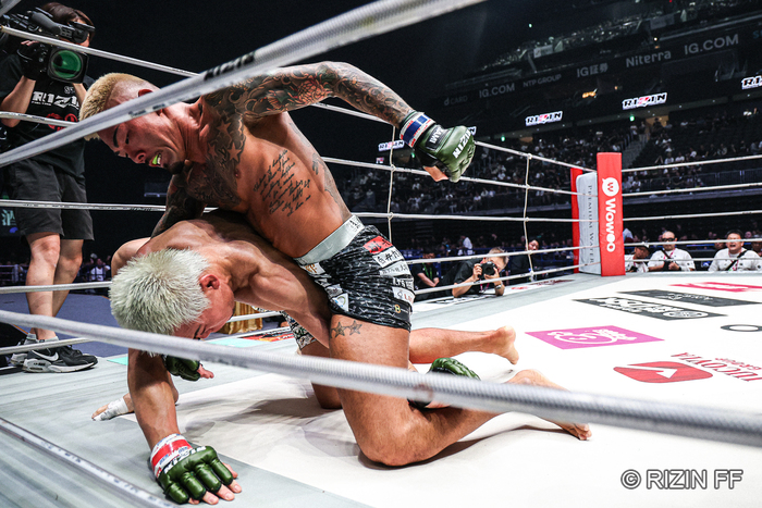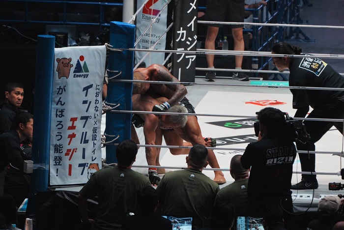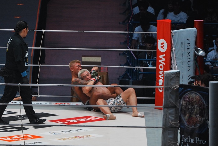 コーナー背に上体立てる太田は立ち上がり離れる。ワンツーヒザの太田は右アッパー、しかし洸助はダブルレッグでコーナーに押し込み、組んで引き出しテイクダウン。左足を右ヒザを上に乗せて左手でパウンド。さらにヒザを突いてゴング。